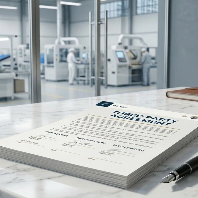 You maintain the direct commercial relationship with the factory and pay them directly; FMT Flow never takes title to your goods.
